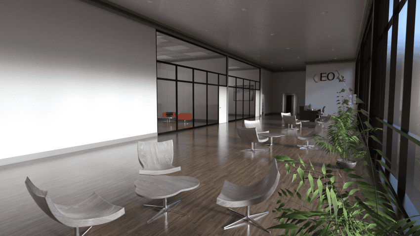 The waiting area in this 3d office environment is out of this world. It features a set of comfortable and elegant-looking chairs. Plus, the view outside, thanks to the glass wall, is irresistible.