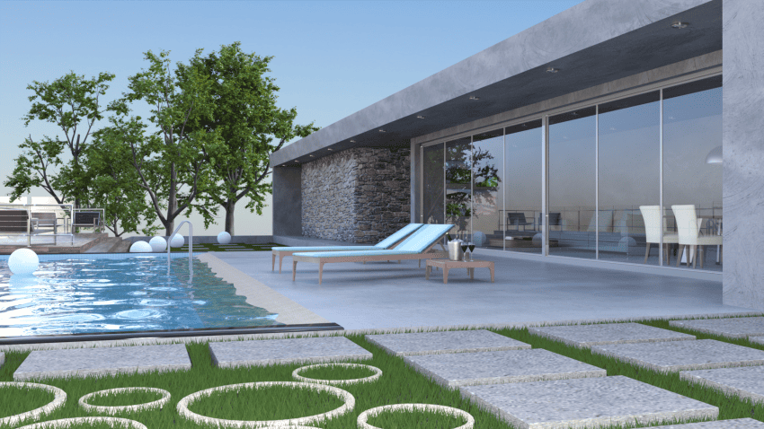 In-between the sofas and the swimming pool is a well-designed sliding glass door, which allows an ample supply of natural light into the building, making it look more realistic and inviting.