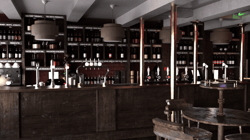 A low lit environment is a popular option for real-life bars. It is what bar-goers prefer. So, this Trendy City Barโs low lit environment is unique. Furthermore, the lighting, setup, and props not only make it irresistible but suitable for a range of applications.